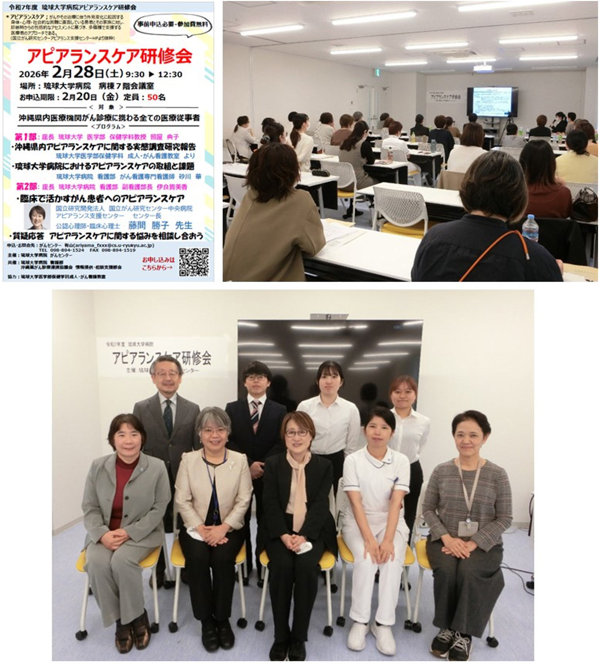 On Saturday, February 28, 2026, at the Appearance Care Seminar for healthcare professionals hosted by the Cancer Center of Ryukyu University Hospital, three students—Mr. Ousuke Sanabe, Ms. Sakurako Ichikawa, and Ms. Kiwa Obuchi—presented the findings of their undergraduate research projects.